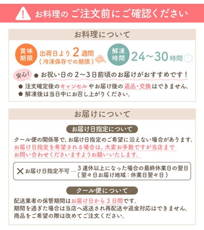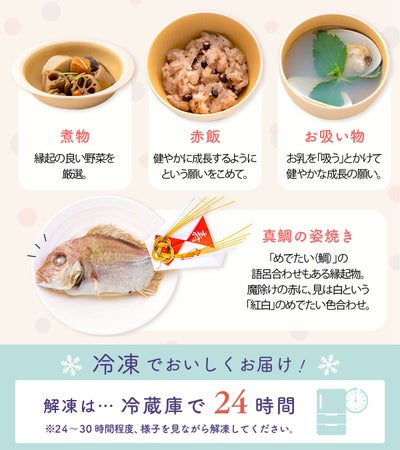 お祝い儀式の予定前(24~30時間前)に冷蔵室に移し解凍してください。