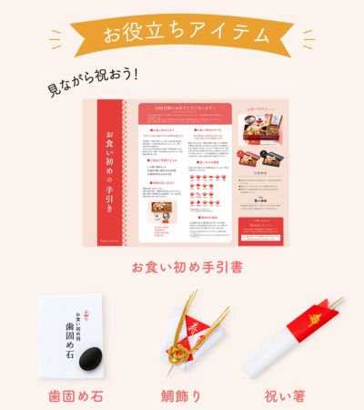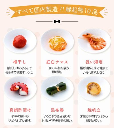 ■セット内容:焼き鯛・焼帆立・昆布巻・梅干し・紅白ナマス・祝い海老・真蛸酢漬け・赤飯・煮物・お吸い物(蛤)・歯固め石・祝い箸