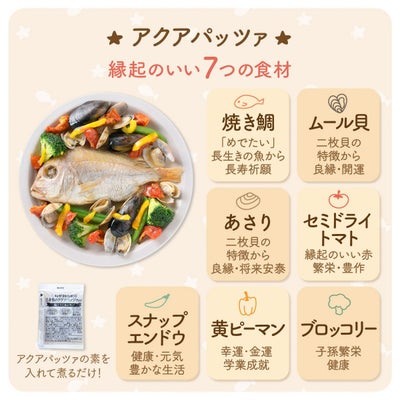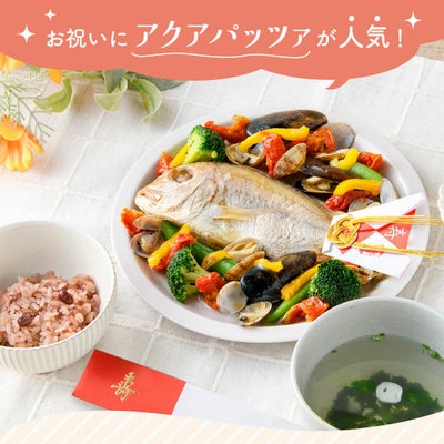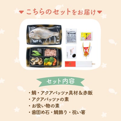 ■セット内容:焼き鯛・殻付ムール貝・殻付あさり・セミドライトマト・ブロッコリー・スナップエンドウ・黄ピーマン・アクアパッツァの素・赤飯・歯固め石・祝い箸