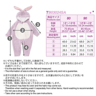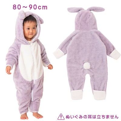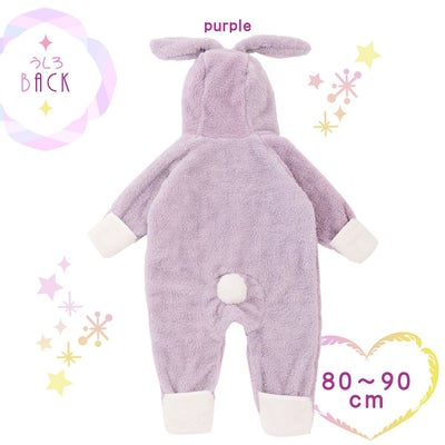 うさぎのもこもこカバーオールです。ハロウィンやクリスマスの仮装に、テーマパークでのコスプレ衣装に。フードには耳、お尻にはふわふわシッポがついていて、男の子も女の子もかわいく着こなせます。袖口と足口は折り返し仕様ですので、冬の寒い時期にベビーカーなどでお出かけしても暖かくおすすめです。