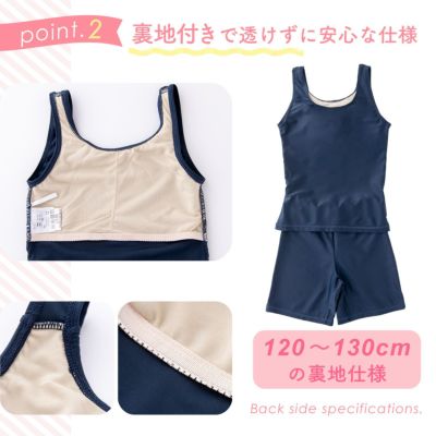 140サイズから170サイズは胸パッドがついています(取り外し可能)UVカット加工肌に優しいフラット仕上げ