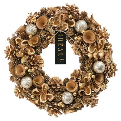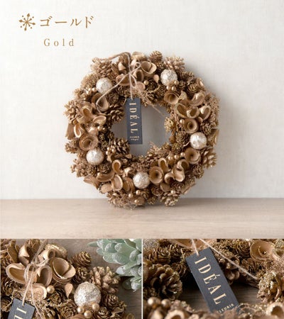 ・ゴールド…たっぷりの松ぼっくりとオーナメントボールで華やかな雰囲気に。豪華なカラーですが、天然素材で温かみも感じられます。