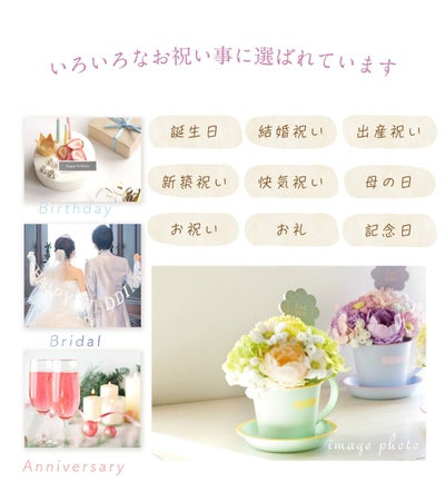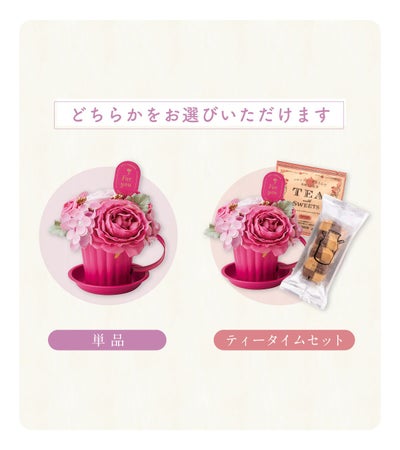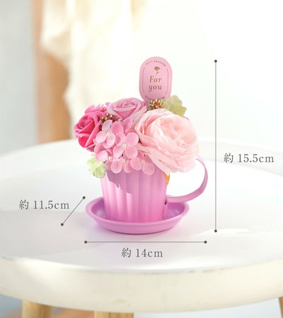 フラワーアレンジ:140×115×155Hmm(ピック込み高さ)(皿/105Φ×15Hmm)、紅茶(外装):W100×H100×D7mm