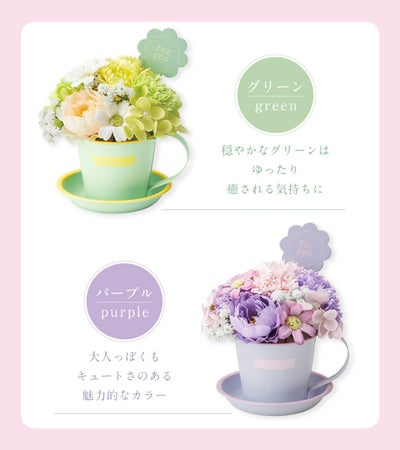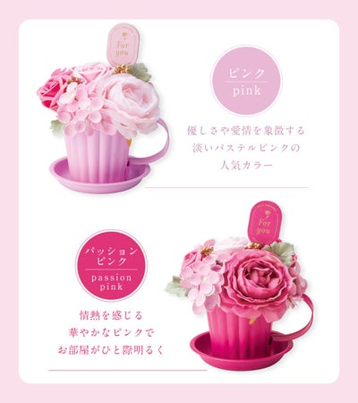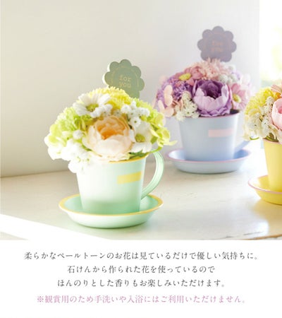 柔らかなペールトーンのお花は見ているだけで優しい気持ちになりそうです。石けんから作られた花を使っているのでほんのり香りをお楽しみいただけます。(ご注意:観賞用のため手洗いや入浴にはご利用いただけません)