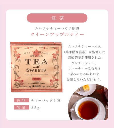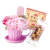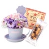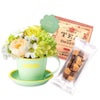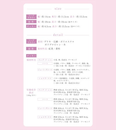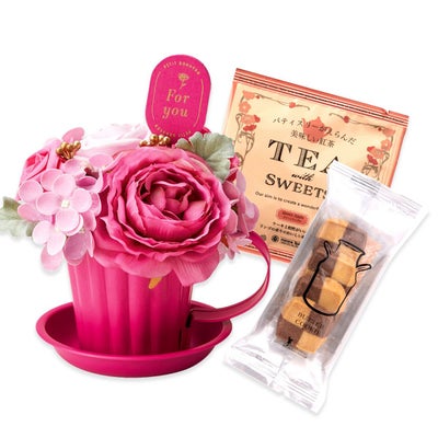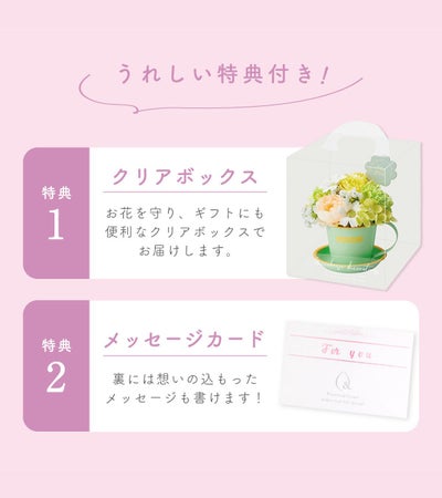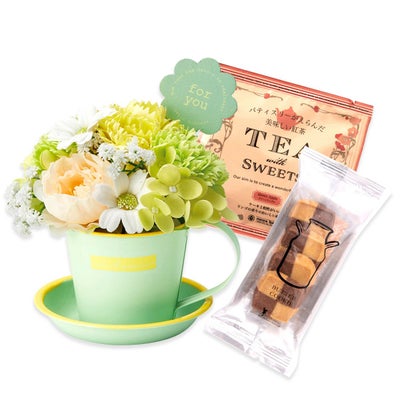フラワーアレンジ(クリアボックス入り)、ティーバッグ×1袋(1包、2.5g)、クッキー×1袋、無料カード(For You)×1枚