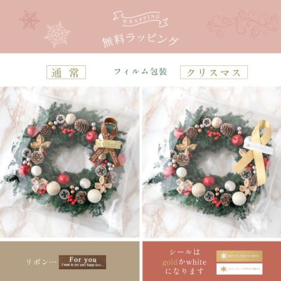 クリスマスの定番色であるグリーン&レッドのリースです。