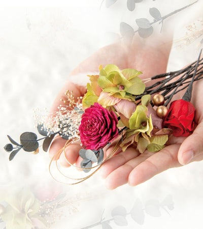 素材はプリザーブドフラワーや造花など、長持ちするお花です。
