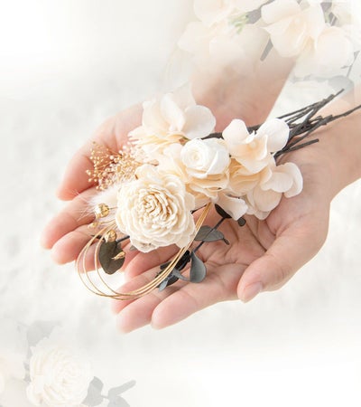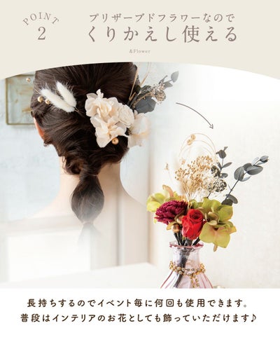 前撮りの後に式本番、成人式の後に卒業式など、繰り返しお使い頂けるのも嬉しいポイントです。(普段はインテリアのお花として飾っていただくこともできます♪)