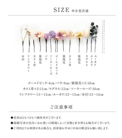 ・花部分:ゴールドピック1cm、バラ2.5~3.5cm、アジサイ3.5~5cm、カスミ草6~8cm、ラグラス4~6cm、ソーラーローズ3.5~4.5cm、リンフラワー8~10cm、ユーカリ6~7.5cm、水引9~11cm
