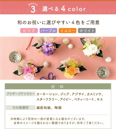 ・プリザーブドフラワー…カーネーション、ジニア、アジサイ、カスミソウ、スターフラワー、アイビー、ぺティーコート、モス