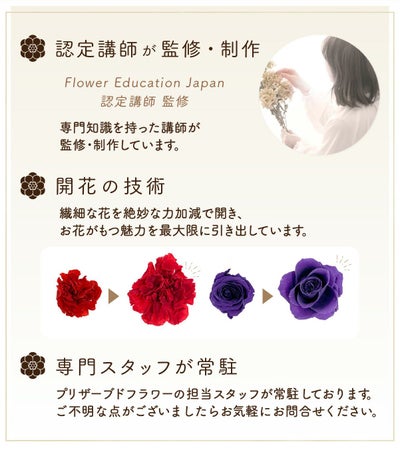 ※一つ一つ丁寧にお作りしておりますが、プリザーブドフラワーの特性上、お手元に届くまでの間に花びらの一部が取れてしまうことがあります。予めご了承くださいませ。
