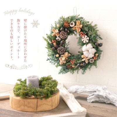 ぶどうづるのベースに天然のヒムロスギをたっぷり巻いて、様々な木の実でデコレーション致しました。すべて本物の素材を使用していますので、香りや手ざわりもあわせてお楽しみいただけます(香りは少しずつ弱くなります。)