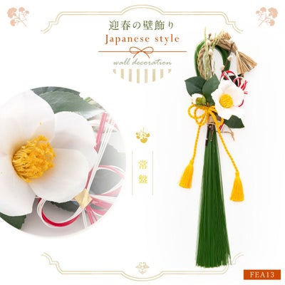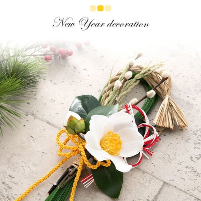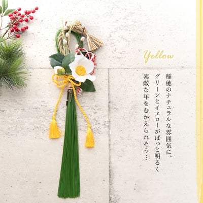 アーティフィシャル(造花)の松葉が印象的な縦長ラインの迎春飾りです。おめでたい白椿に縁起の良い黄色や稲穂でお正月らしい雰囲気に。スッとしたシルエットの和モダンデザインですので、和室にも洋室にも飾って頂けます。