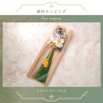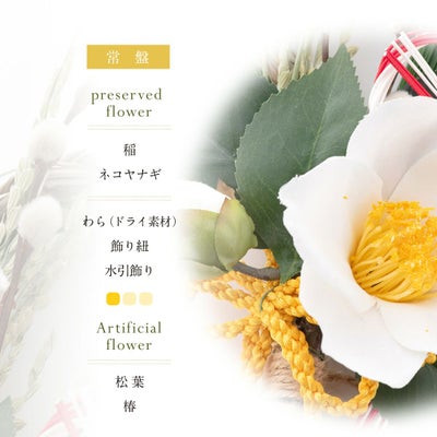 ネコヤナギ(プリザーブド)、稲(プリザーブド)、松葉(アーティフィシャル)、椿(アーティフィシャル)、わら(ドライ素材)、飾り紐、水引飾り