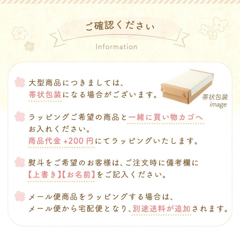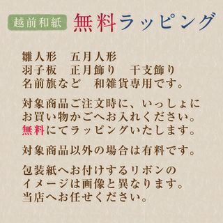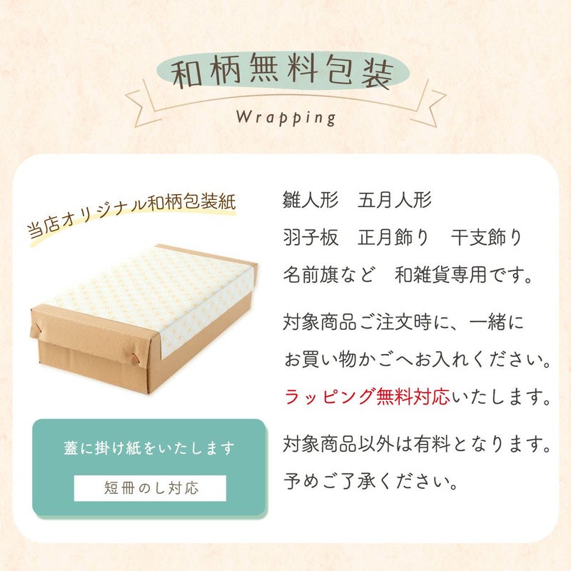 他の画像を見る 販売価格 ¥ 200 税込 【ラッピング 人形和雑貨・名前旗】 専用 ひな人形・五月人形・干支・正月飾り ご出産祝い プレゼント等に 和風包装紙でかわいくラッピング 詳細を見る お気に入りに登録する