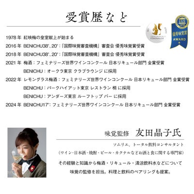 日本のほぼ中心に位置する福井県若狭町はラムサール条約に登録された「三方五湖」など豊かな自然にめぐまれています。若狭町に自社梅園をもち、若狭の地で生産された「紅映梅(べにさしうめ)」100%を使い、自社工場で無添加(酸味料・香料・着色料)の本格梅酒づくりをしている会社です。梅の生産、加工、販売まで全てを手掛けています。2013年3月には、農林水産省より6次産業総合計画認定を受けました。梅酒製造工場は、2020年5月にHACCP認証(福井県版)を受けています。 |