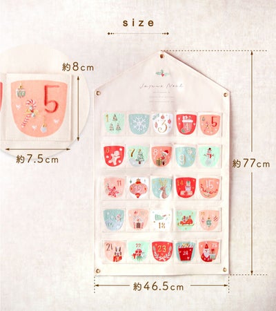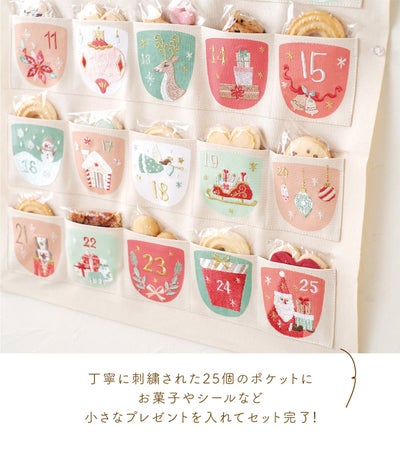 丁寧に刺繍された25個のポケットに、お菓子やシールなど小さなプレゼントを入れたらセット完了です。