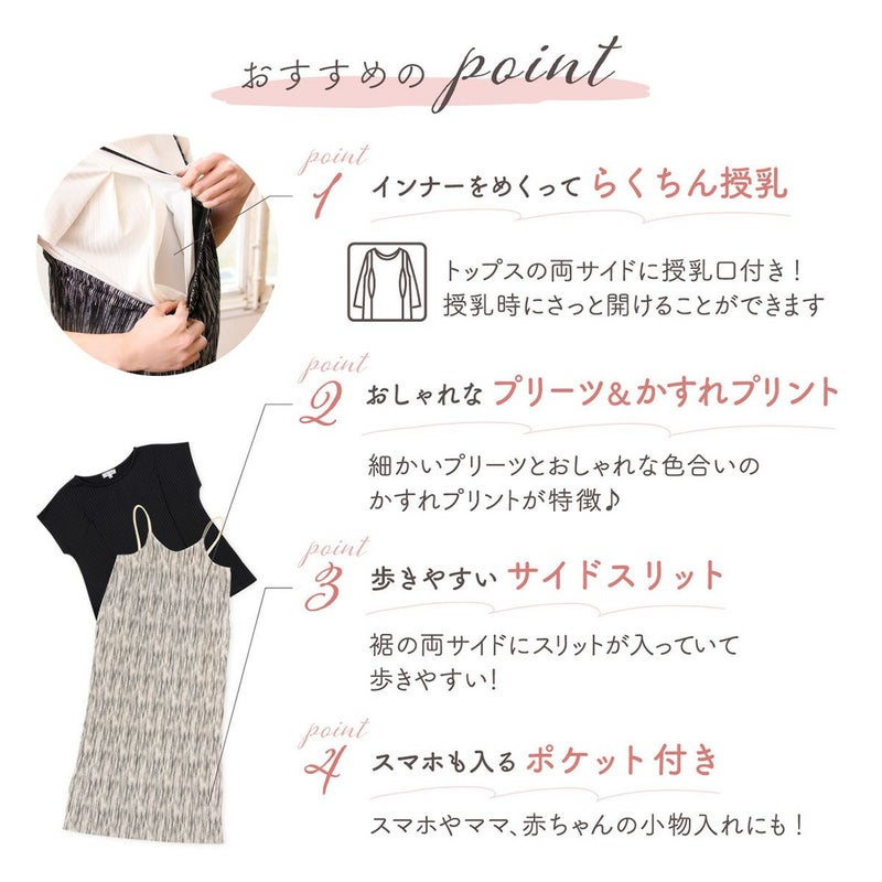 他の画像を見る 販売価格 ¥ 4,990 税込 カートに入れる お気に入りに登録する 着心地が良いマタニティルームウェア。トップスの両サイドから、らくちん授乳。歩きやすいサイドスリット。 【新商品】マタニティ ワンピース 半袖 春夏 マタニティウェア ワンピアンサンブル キャミワンピ ロング丈 ゆったり 肌にやさしい 産前産後 授乳可能 妊婦 ママ 妊娠 ローズマダム レディース おしゃれ プリーツ
