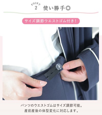 パンツのウエストゴムはサイズ調節が可能。産前産後の体型変化に対応します。