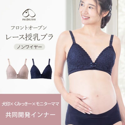 マタニティブラ 授乳ブラ 犬印本舗 フロントオープンレース授乳ブラ くみっきー 共同開発 授乳ブラジャー 垂れ防止 ノンワイヤー マタニティ下着 マタニティブラジャー 妊娠 妊婦 出産 おしゃれ 育乳ブラ 締め付けない 授乳 前開き モーブピンク ネイビー