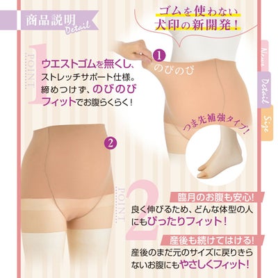 産前から産後までなが~く着用できます。お腹全体がらくらく仕様のため、パンティ部全体で支えて締めつけにくいパンストです。レッグ部分はゾッキタイプで横じまにならずにしっかりフィットします。パンティ部は、ウエストゴムを無くし、フィット感のある総ストレッチサポート仕様。臨月のお腹にもらくらくフィット!産後のまだ元のサイズに戻りきらないお腹にもやさしくフィットします。