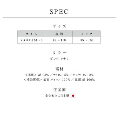 素材 綿93% ナイロン5% ポリウレタン2% 補助腹帯表側 ナイロン100% 補助腹帯裏側 綿100% キナリ ピンク マタニティM-L 腹囲 78-100 ヒップ 85-103 補助腹帯セットお腹を支える 補助腹帯 犬印