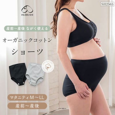 マタニティ ショーツ パンツ 犬印 犬印本舗 出産準備 産前産後 オーガニックコットンショーツ 深ばきタイプ 綿100% ハイウエスト 大人気 産前 産後 インナー 下着 パンツ リブ マタニティショーツ オーガニックコットン M L フェムケア ブラック グレー