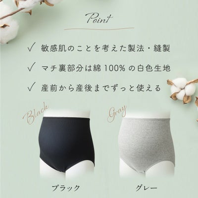 産前から産後までずっと使える、肌にやさしい綿100%のオーガニックコットン。敏感肌のことを考えた製法、縫製で締め付けず、 ストレスフリー。