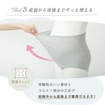 伸縮性のいい素材とウエスト部分の工夫で、妊娠中から産後まで着用いただけます。