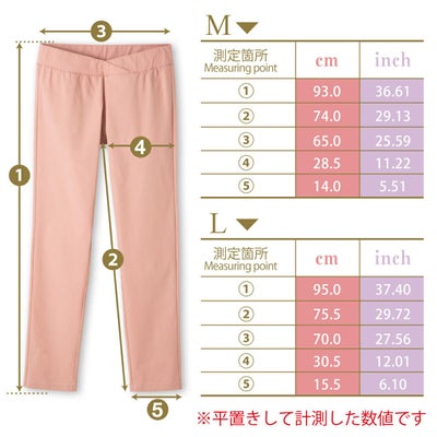 マタニティL :総丈95、股下75.5、ウエスト70、腹囲82、ヒップ94.5、わたり巾30.5、ひざ巾19.5、裾巾15.5(cm)