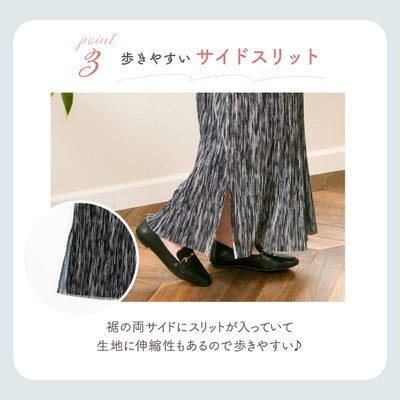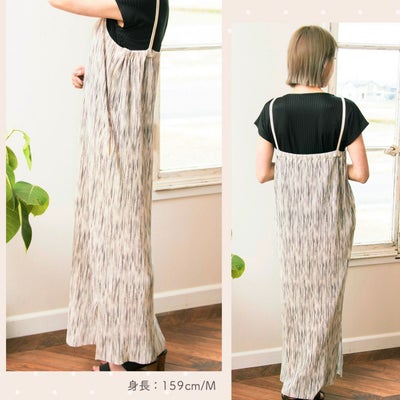ワンピース背面の上面はゴム仕様となっていて、細かいプリーツとおしゃれな色合いのかすれプリントが特徴です。裾の両サイドにはスリットが入っています。