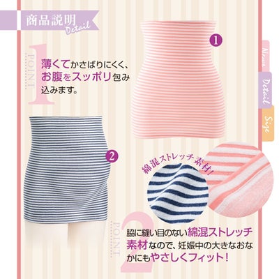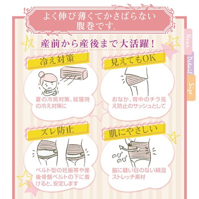 薄くてかさばりにくく、お腹をすっぽり筒み込む腹巻です。薄い素材で夏の冷房対策や就寝時におすすめです。マタニティパンツのイン(腹巻)orアウト(サッシュ)両方の着用が出来ます。産前から産後まで着用して頂けます。サポートベルトタイプの妊婦帯との組み合わせがオススメ。肌に優しい綿混素材です。よく伸び薄くてかさばらない。