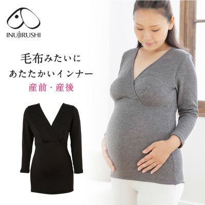 マタニティ 犬印 犬印本舗 キャミソール カシュクールオープン仕様 8分袖タイプ 挿入パット付き 裏起毛 妊婦 出産準備 産前産後 インナー 毛布みたいにあたたかいインナー 妊娠祝い 出産祝い ブラック グレー M L TS3778