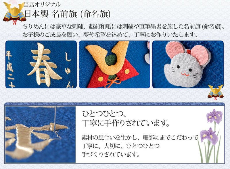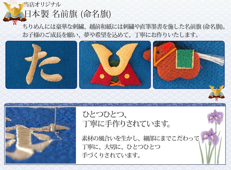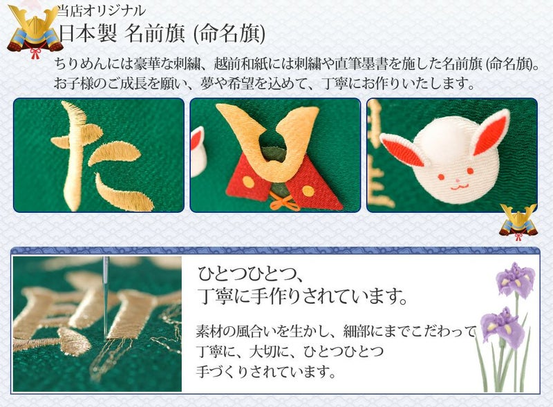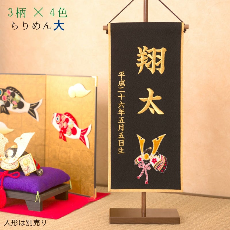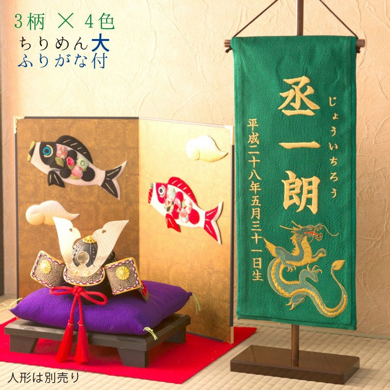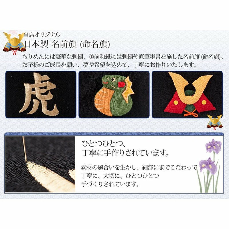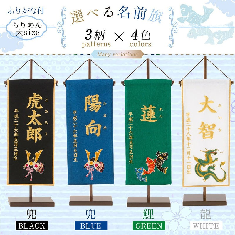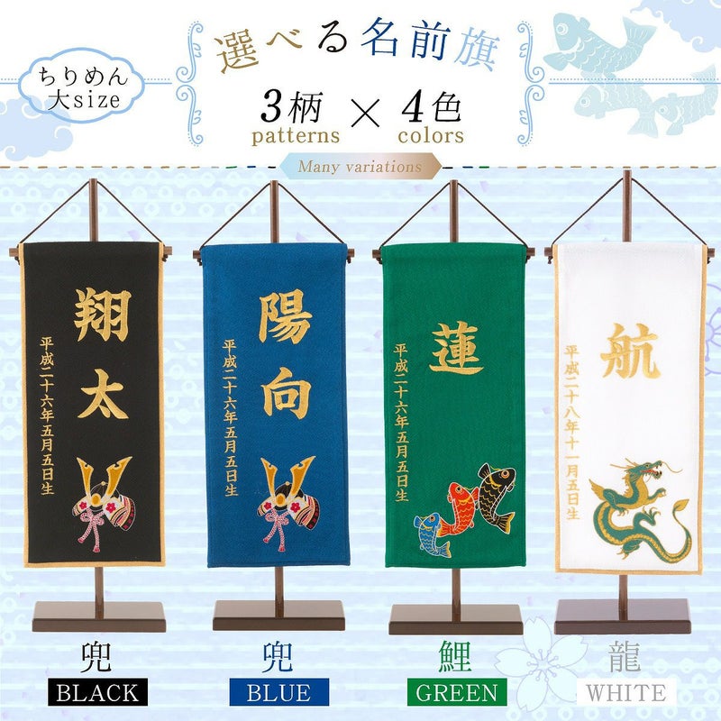 他の画像を見る 定価 ¥ 16,300 のところ 販売価格 ¥ 16,300 税込 詳細を見る お気に入りに登録する 送料無料 初節句のお祝いギフトにも最適! ひな人形と一緒に飾ればより一層華やかに! 名前旗 男の子 刺繍 五月人形 兜 鯉 龍 ちりめん 命名旗