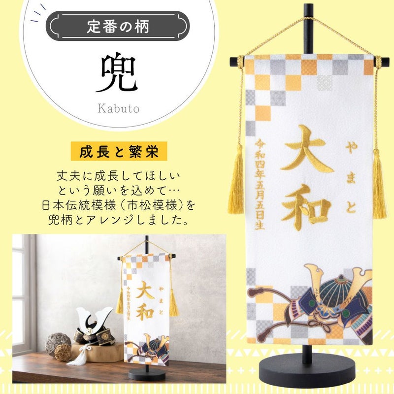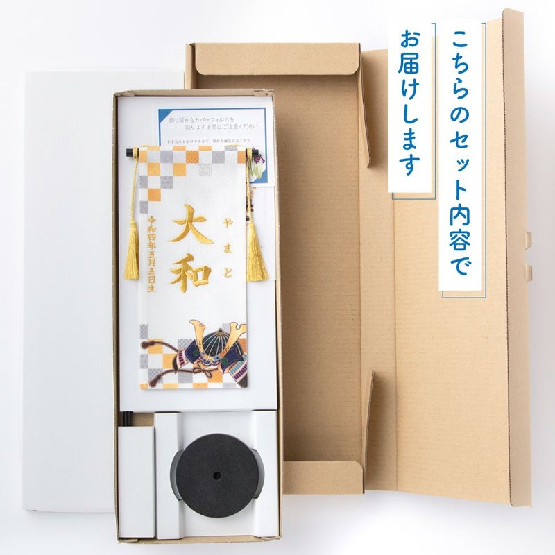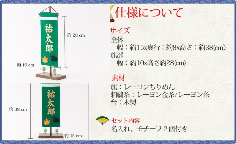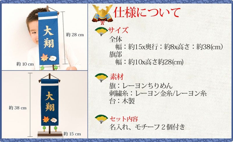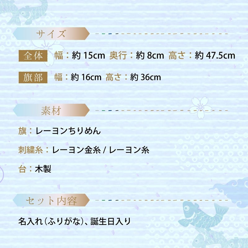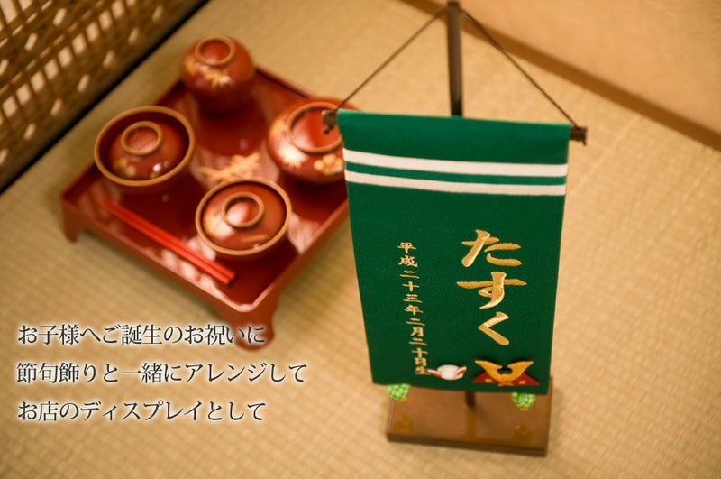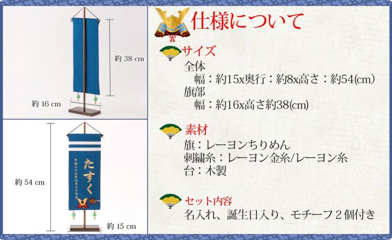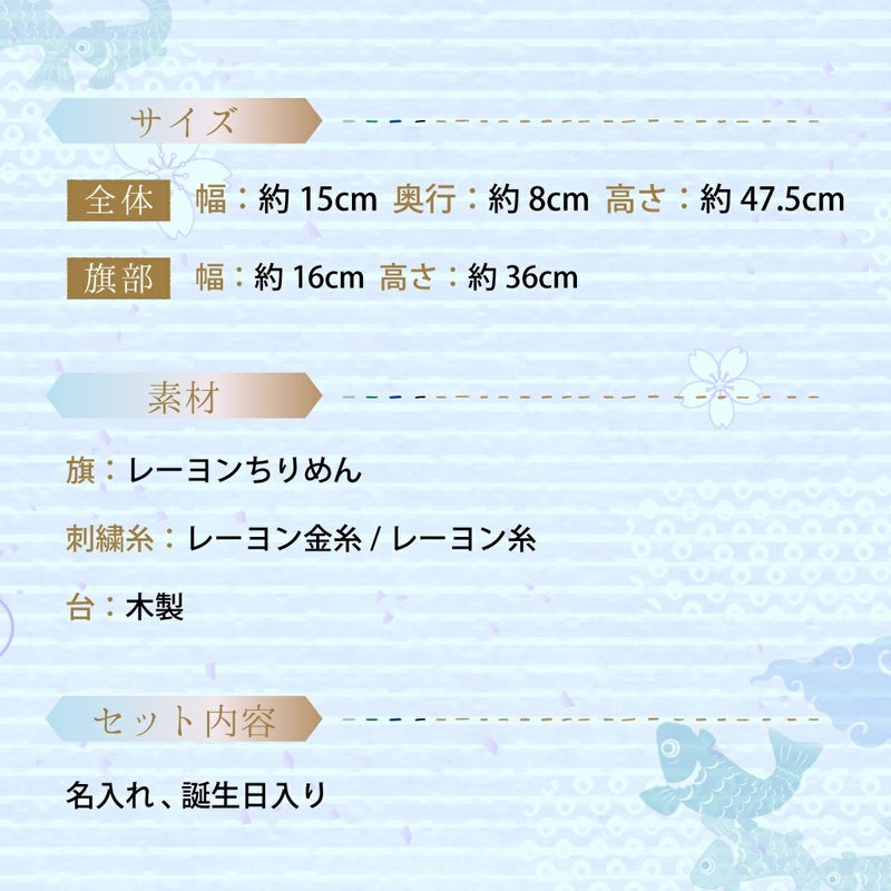 他の画像を見る 定価 ¥ 6,980 のところ 販売価格 ¥ 5,980 税込 詳細を見る お気に入りに登録する メール便送料無料 初節句のお祝いギフトにも最適! 五月人形と一緒に飾ればより一層華やかに! 名前旗 男の子 刺繍 五月人形 コンパクト 兜 鯉 菖蒲柄 サテン 命名旗