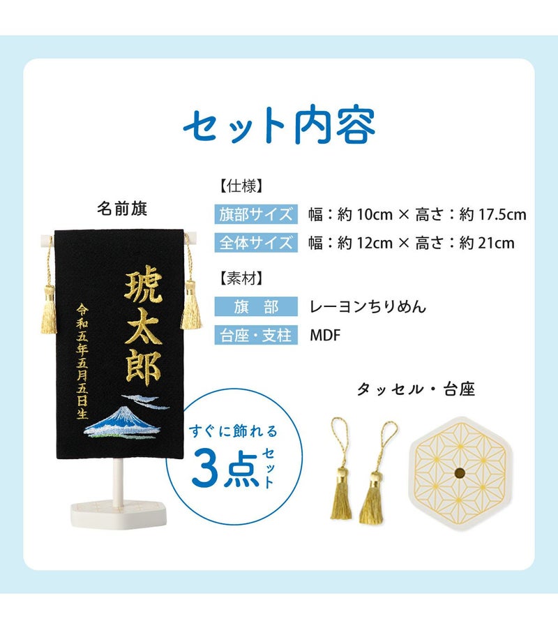 他の画像を見る 定価 ¥ 9,400 のところ 販売価格 ¥ 9,400 税込 詳細を見る お気に入りに登録する 送料無料 メール便(ポスト投函)で名前旗 ミニ 台座 富士山 ギフト 名入れ 刺繍 かわいい 五月人形 コンパクト 七五三 出産祝 お誕生のお祝いお食い初めや初節句と一緒に ミニ名前旗 刺繍 男の子 五月人形 コンパクト 2026年 命名旗