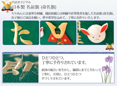 名前旗 端午の節句 五月人形 節句人形 命名 ちりめん 刺繍 名入れ ご出産のお祝いや初節句の贈り物に大人気です。 素材を生かし細かいところにまでこだわって手づくりされていますので、非常に趣もございます。端午の節句 五月人形 節句人形 生地はちりめん、金糸で刺繍と豪華な組み合わせでお作りさせて頂いています。かわいい鈴毬と小さな干支のモチーフが一層名前旗を引き立ててくれます。 和雑貨 人形 ちりめん 刺繍 生年月日 名入れ 素材のちりめんの風合いをを生かし、細かいところにまでこだわって丁寧に、大切に、ひとつひとつ手づくりされています。初節句 こいのぼり 鯉のぼり 兜 かぶと 干支モチーフ、季節のモチーフと生地はちりめんで出来ており、ちりめんの風合いが良く生かされています。 お名前とお誕生日を豪華な運針で本格的な刺繍でお作りさせていただいています。