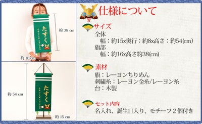 【名前旗 男の子 金色刺繍 (大サイズ) 名前・生年月日入り N-BLG】 送料無料 五月人形 緑色/干支・季節モチーフ ちりめん刺繍旗 初節句