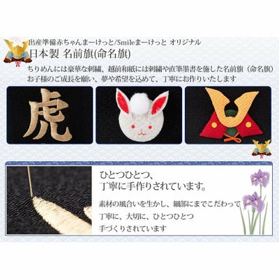 名前旗 端午の節句 五月人形 節句人形 命名 ちりめん 刺繍 名入れ ご出産のお祝いや初節句の贈り物に大人気です。 素材を生かし細かいところにまでこだわって手づくりされていますので、非常に趣もございます。端午の節句 五月人形 節句人形 生地はちりめん、金糸で刺繍と豪華な組み合わせでお作りさせて頂いています。かわいい鈴毬と小さな干支のモチーフが一層名前旗を引き立ててくれます。 和雑貨 人形 ちりめん 刺繍 生年月日 名入れ 素材のちりめんの風合いをを生かし、細かいところにまでこだわって丁寧に、大切に、ひとつひとつ手づくりされています。初節句 こいのぼり 鯉のぼり 兜 かぶと 干支モチーフ、季節のモチーフと生地はちりめんで出来ており、ちりめんの風合いが良く生かされています。 お名前とお誕生日を豪華な運針で本格的な刺繍でお作りさせていただいています。