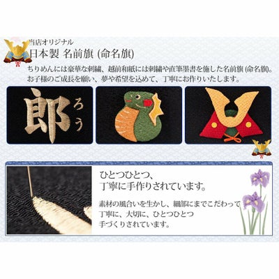 名前旗 端午の節句 五月人形 節句人形 命名 ちりめん 刺繍 名入れ ご出産のお祝いや初節句の贈り物に大人気です。 素材を生かし細かいところにまでこだわって手づくりされていますので、非常に趣もございます。端午の節句 五月人形 節句人形 生地はちりめん、金糸で刺繍と豪華な組み合わせでお作りさせて頂いています。かわいい鈴毬と小さな干支のモチーフが一層名前旗を引き立ててくれます。 和雑貨 人形 ちりめん 刺繍 生年月日 名入れ 素材のちりめんの風合いをを生かし、細かいところにまでこだわって丁寧に、大切に、ひとつひとつ手づくりされています。初節句 こいのぼり 鯉のぼり 兜 かぶと 干支モチーフ、季節のモチーフと生地はちりめんで出来ており、ちりめんの風合いが良く生かされています。 お名前とお誕生日を豪華な運針で本格的な刺繍でお作りさせていただいています。