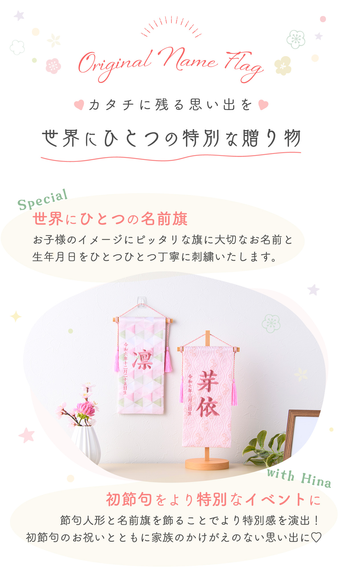 他の画像を見る 販売価格 ¥ 9,400 税込 詳細を見る お気に入りに登録する メール便送料無料 初節句のお祝いギフトにも最適! ひな人形と一緒に飾ればより一層華やかに! 名前旗 女の子 刺繍 雛人形 かわいい ミニ 花 ちりめん 命名旗 刺繍旗