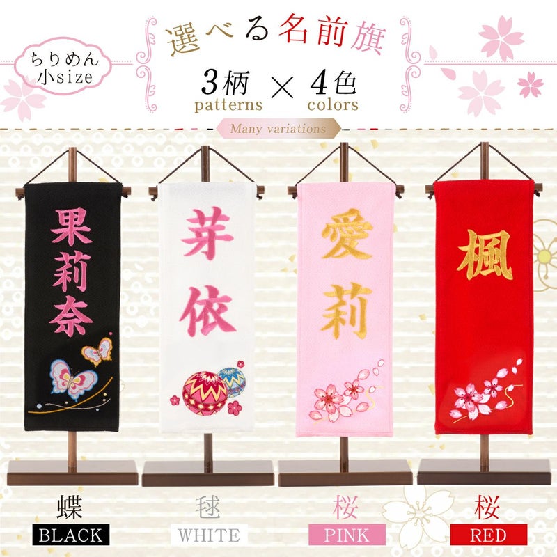 他の画像を見る 販売価格 ¥ 11,280 税込 初節句のお祝いギフトにも最適! ひな人形と一緒に飾ればより一層華やかに! 名前旗 女の子 刺繍 雛人形 かわいい 蝶 桜 鞠 ちりめん 命名旗 送料無料 詳細を見る お気に入りに登録する