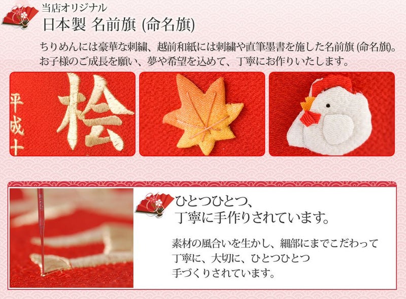 他の画像を見る 販売価格 ¥ 17,880 税込 初節句のお祝いギフトにも最適! ひな人形と一緒に飾ればより一層華やかに! 名前旗 女の子 刺繍 雛人形 かわいい 干支モチーフ ちりめん 命名旗 送料無料 詳細を見る お気に入りに登録する