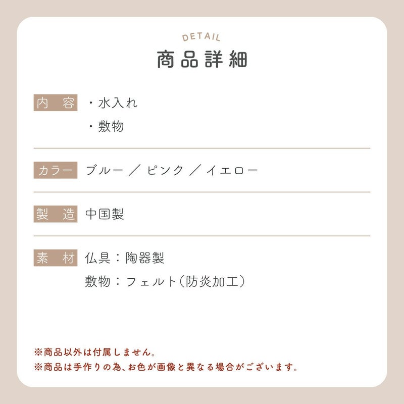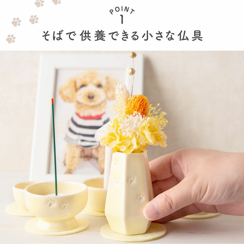 他の画像を見る 販売価格 ¥ 990 税込 お盆飾り お盆 お彼岸 命日 月命日 初盆 新盆 仏具 御先祖 先祖供養 夏 小さい 京都 リュウコドウ 京都 和雑貨 ペット メモリアル 供養 ペット供養 お供え 記念品 お悔やみ ペット仏具 花立て(3色) 敷物付 置物 かわいい 足あと 陶磁器 リュウコドウ カートに入れる お気に入りに登録する