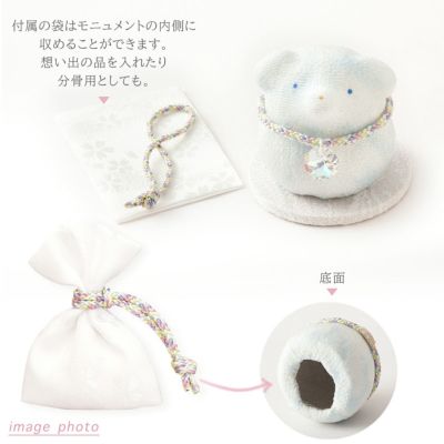 ちりめん生地を使ったふんわり温もりを感じるペット用の祭壇です。置く場所を選ばず、いつも近くに置いておけるコンパクトなサイズ感です。モニュメントの犬の首輪に光が当たるとキラキラと小さな虹がうまれます。布製の袋が付属しており、モニュメントの内側に収めることができるようになっておりますので、思い出の品を入れたり、分骨用としてもお使いいただけます。フレーム用にカードも付属していますので、お名前などを書き込んでメモリアルスペースにしていただけます。もちろんお写真も入れることができます。お空のおともだちをイメージした祭壇となっています。