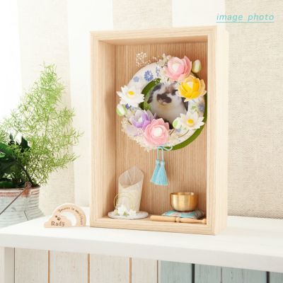 大切な家族が心安らかにいられるよう、京都の職人が心を込めて手作りしたフレーム型のちりめん細工のペット用祭壇です。置く場所を選ばず、いつも近くに置いておけるコンパクトなサイズ感です。そのまま祭壇としてお使いいただくほか、LEDライトやおりんなどを取り出し、中に思い出の品やお写真などを飾ってメモリアルボックスとしてお使いいただくこともできます。メモリアルボックスとしてご使用いただく際にはめていただけるガラス蓋も付属しております。リースにはL判の写真を挟んで飾ることができます。