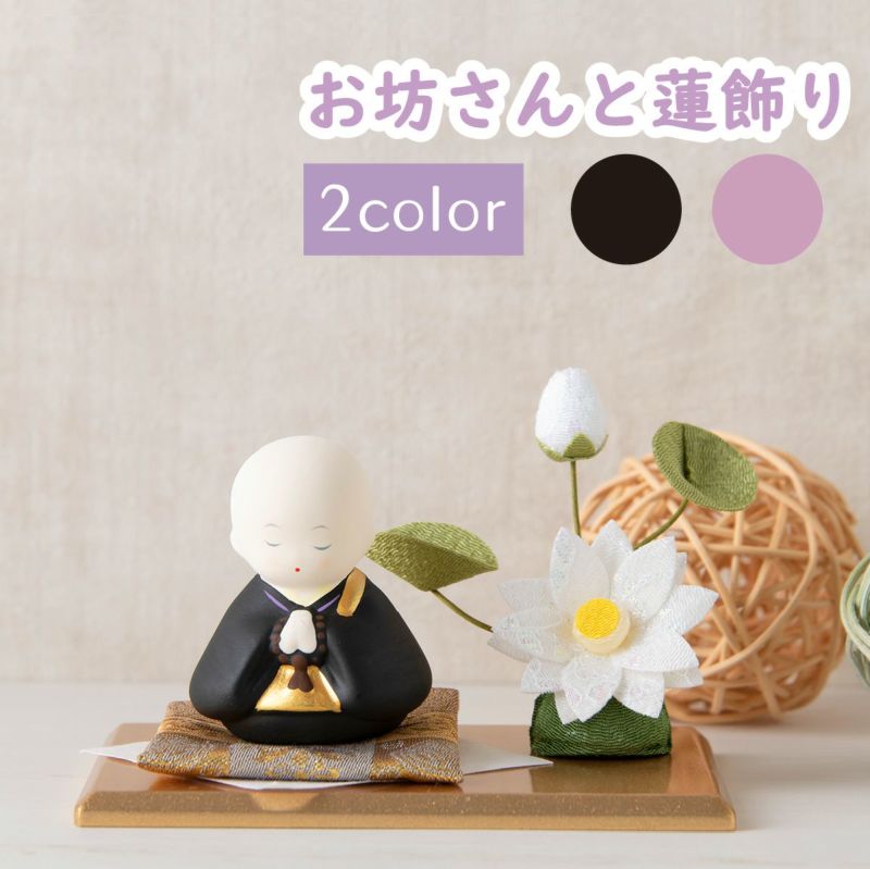 お供え お供え物 仏具 お盆 新盆 初盆 お悔み お飾り お坊さんと蓮飾り(2色)陶器製 敷き紙付 和紙 手のひらサイズ 仏壇用 新盆 お彼岸 かわいい 小さめ コンパクトサイズ ペット仏具 置物 和雑貨 紫/黒