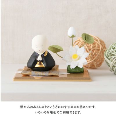 手のひらサイズのやさしいお顔のお坊さんです。また、蓮の花は仏教では極楽浄土に咲くものととして最上の花と言われています。