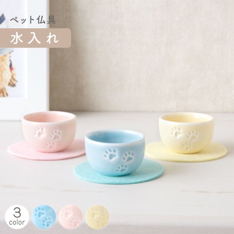 ペット メモリアル 供養 ペット供養 お供え 記念品 お悔やみ ペット仏具 水入れ(3色) 敷物付 置物 かわいい 足あと 陶磁器 置物 メモリアルグッズ リュウコドウ 犬 猫 動物 ブルー/ピンク/イエロー