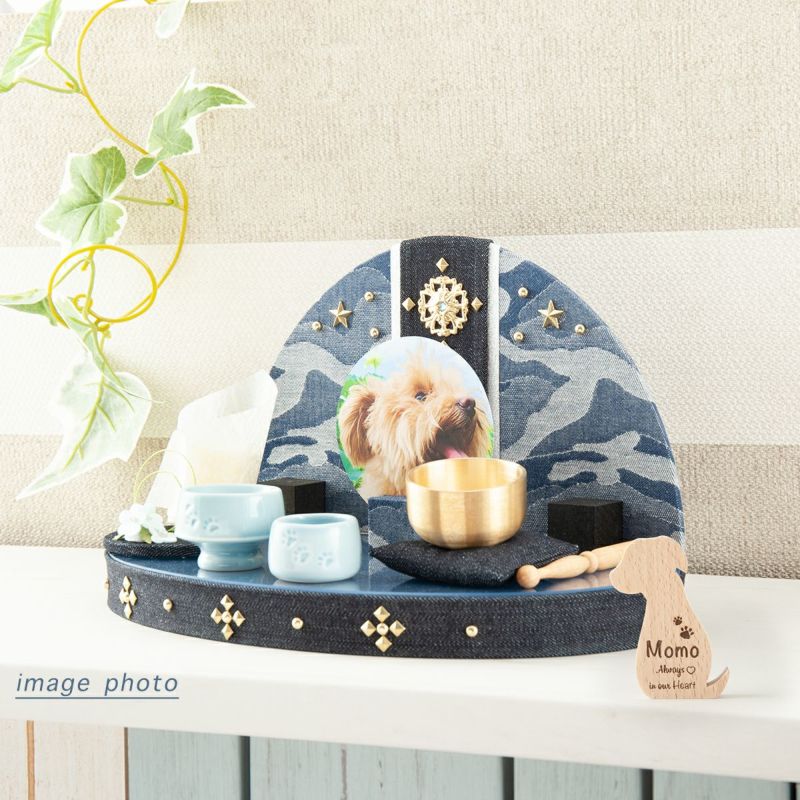 デニム生地を使ったシックな中にカジュアル感のあるペット用祭壇です。夜のお空をイメージしたステージに、スタッズの星を配しました。置く場所を選ばず、いつも近くに置いておけるコンパクトなサイズ感です。職人の手によりひとつひとつ作られたやさしい風合い。大切な家族だったペットを想い、供養していただけます。お空の星になってもいつもそばにいてくれるよう感じられるステージになっています。